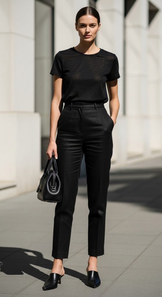 Embracing an all-black outfit is a guaranteed way to appear effortlessly sleek. Tucking a fitted black tee into black linen pants produces an elongated, sophisticated silhouette that’s endlessly versatile. The tonal dressing trend endures for good reasons—it’s simple yet striking.