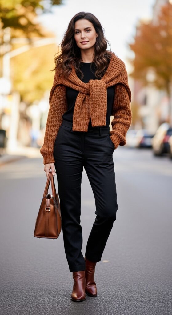 Layer a fitted basic underneath and let the cardigan drape casually for that “busy fashion editor” look. Add ankle boots and a refined tote bag to complete this modern ensemble.