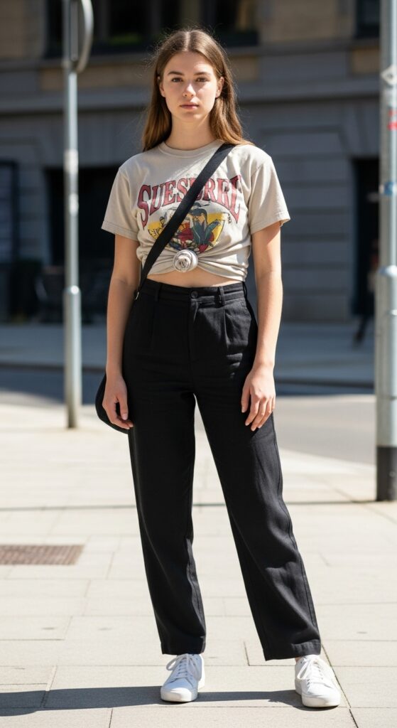 Keep accessories minimal so the tee remains the star: white sneakers, a crossbody bag, and perhaps some layered delicate necklaces. The key here is the front tuck, which defines your waistline and keeps the look purposeful, sidestepping any semblance of sloppiness.
