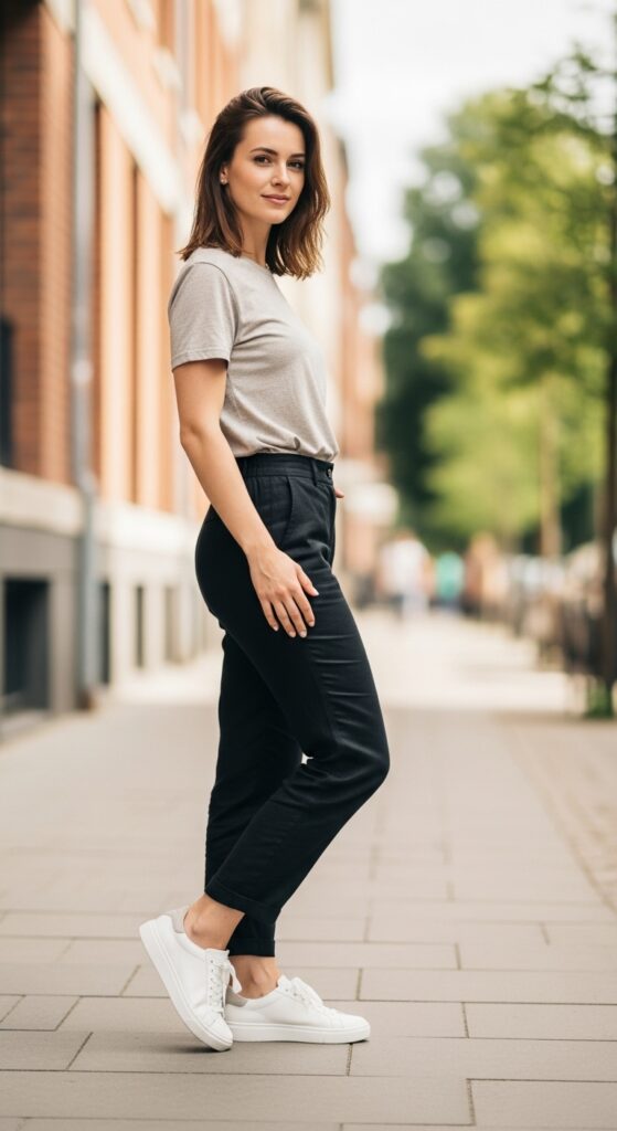 This combo balances comfort, style, and practicality. Add a denim jacket on cooler days, swap sneakers for sandals under warm sunshine, or layer a blazer for professional settings. The core pieces stay constant; only the accents evolve with your schedule.