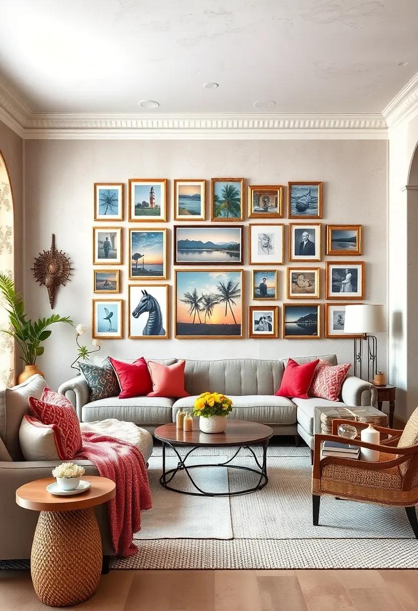 Curated Gallery wall: Create an artistic display with a mix of photographs, prints, and art pieces that tell a story of you and your travels