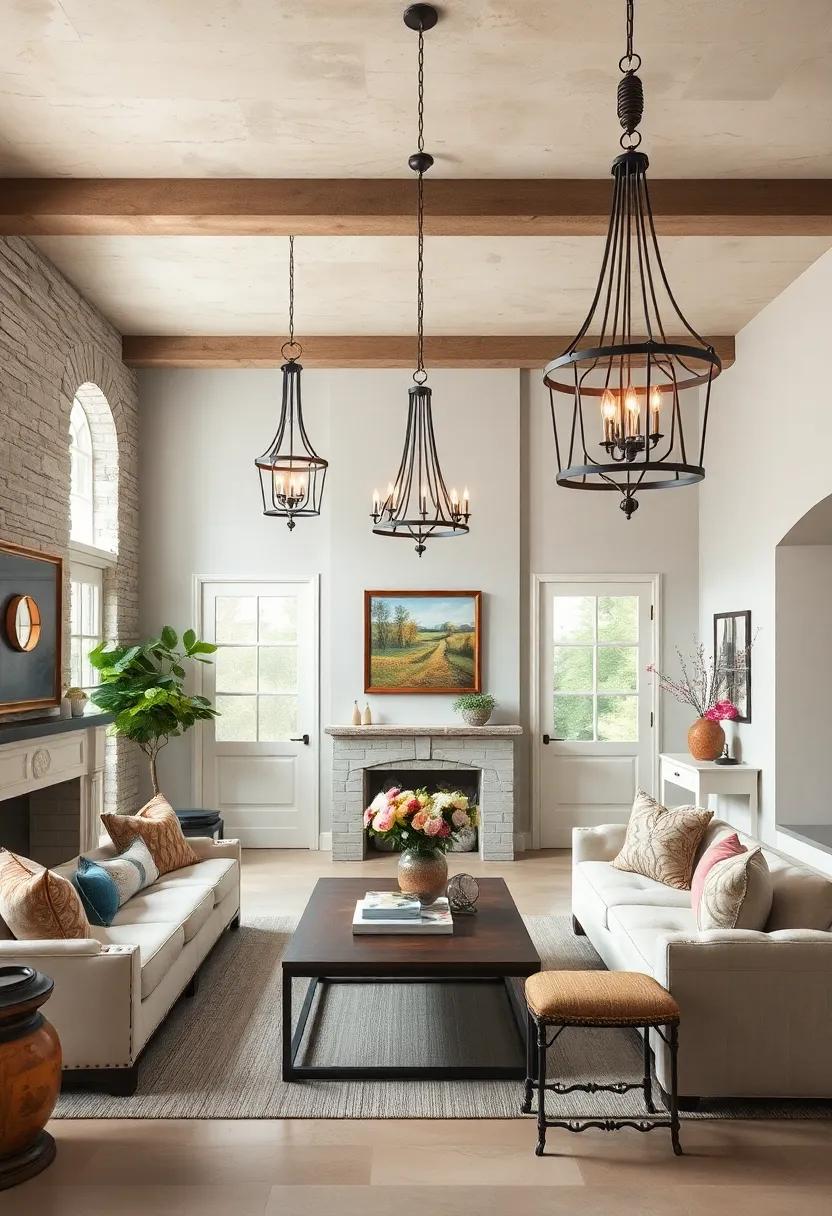 - Statement lighting fixtures: A wrought-iron chandelier hanging elegantly from the beams