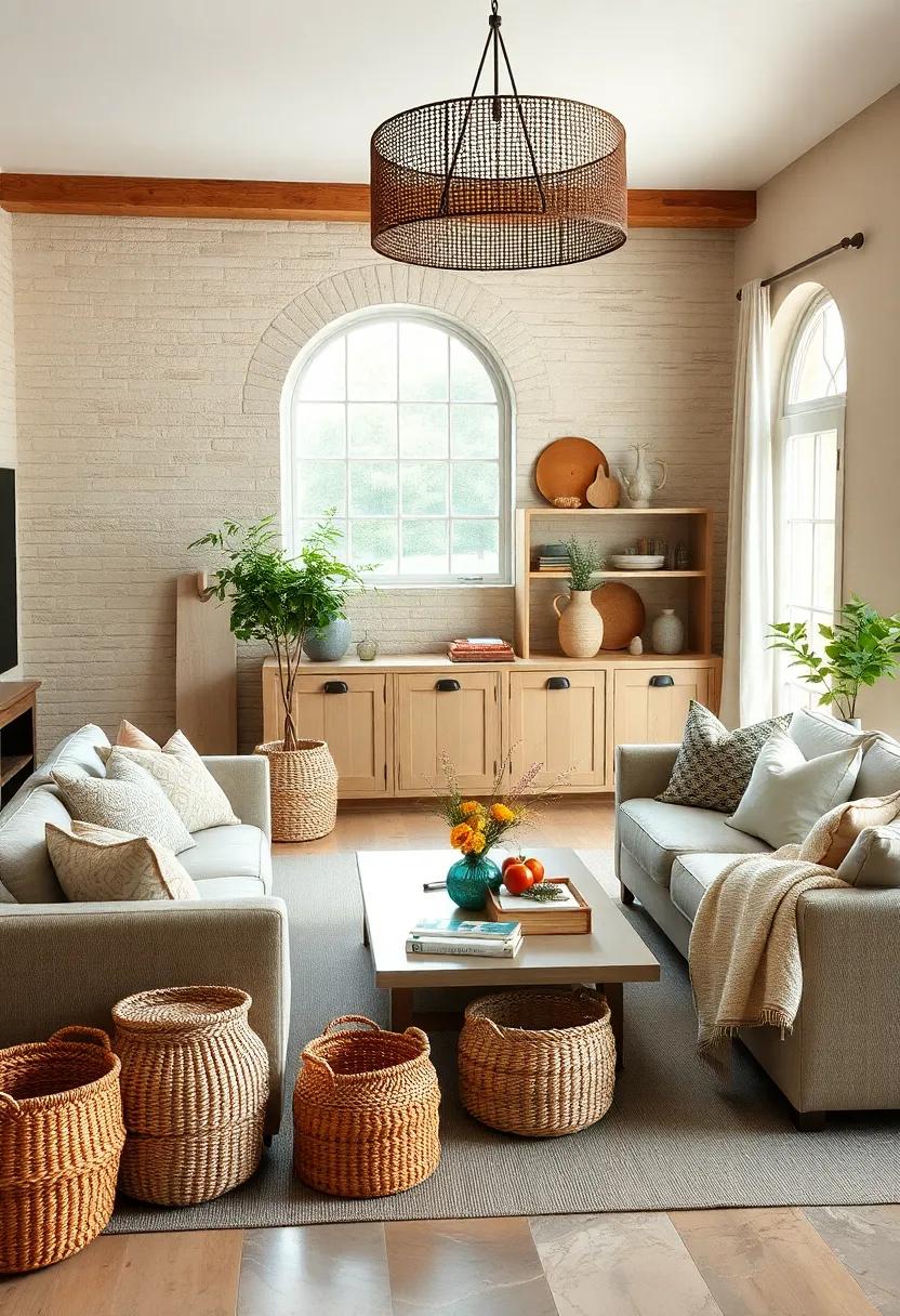- Natural fiber baskets placed around the room introduce tactile warmth and practicality.