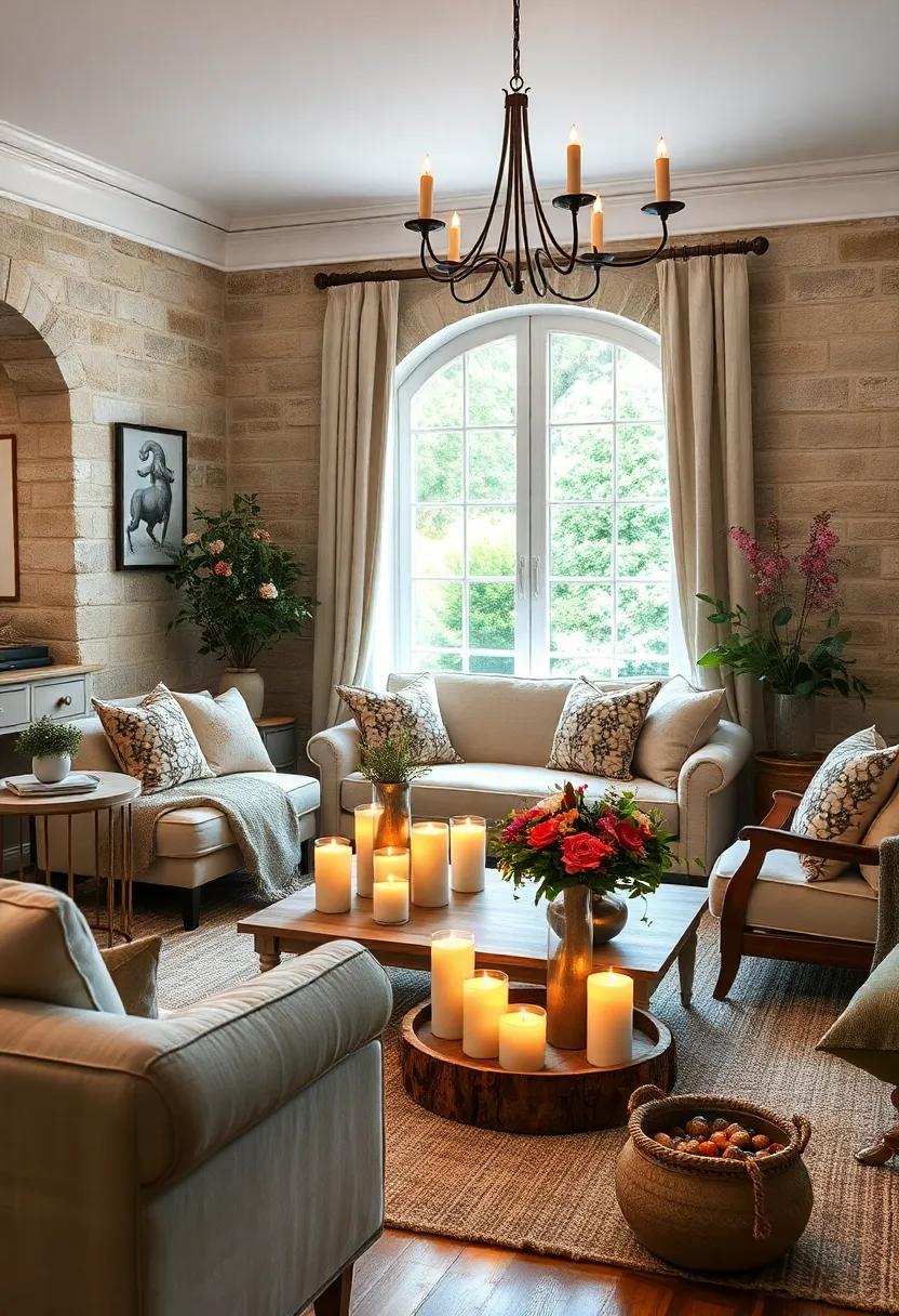 Nothing sets the mood quiet like the warm flicker of candlelight combined with the soothing aroma of beautifully scented candles. In a French country living room adorned with farmhouse influences, the right fragrance can transport you to a serene countryside escape. Choose from a delightful array of scents that complement your rustic decor—think of lavender for a calming effect, vanilla to evoke warmth, or fresh linen for an inviting ambiance. Place them in charming glass jars or vintage holders to harmonize with your space while also adding an elegant touch.