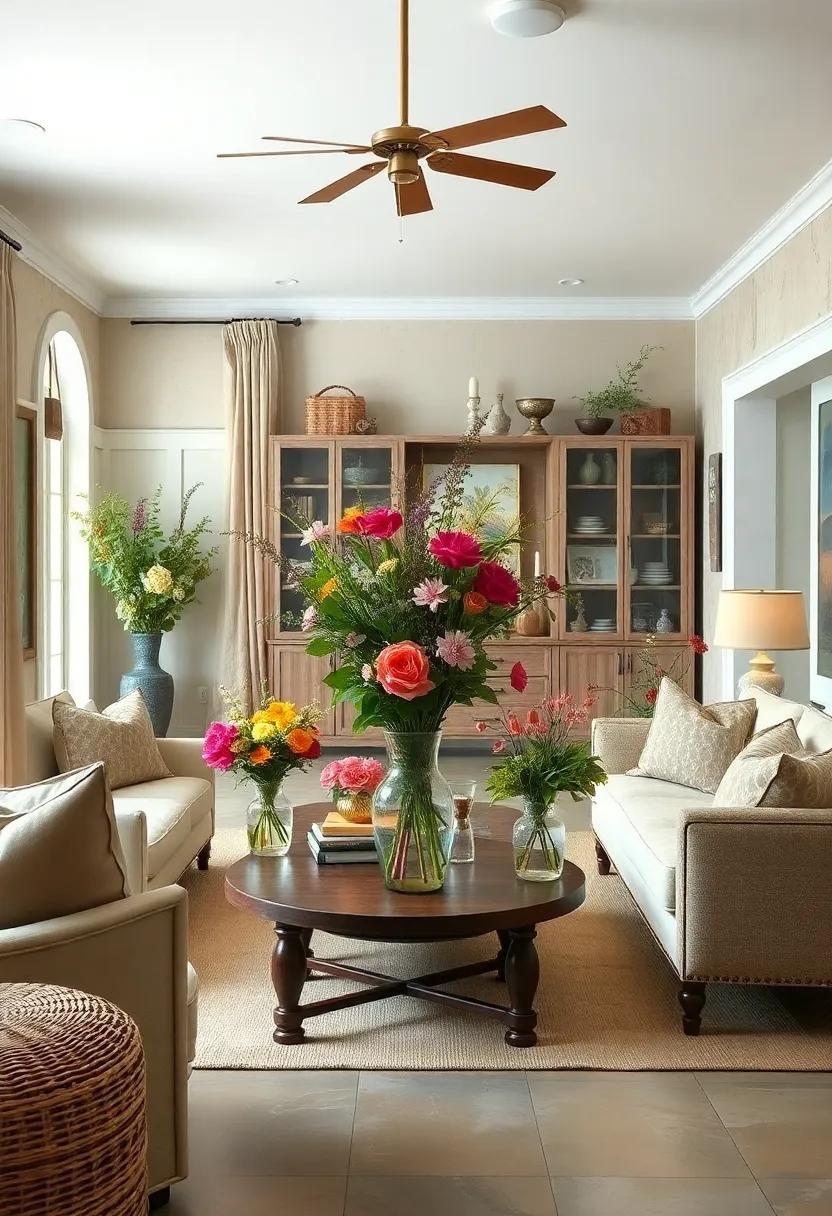 Elegant Floral Arrangements: Bring a splash of color and life with fresh or dried flowers arranged in charming vases throughout the room
