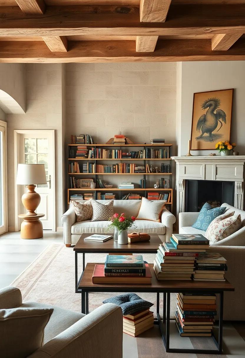 Transform your living space into a literary haven by curating a beautifully arranged collection of vintage books. Stacks of old books in various sizes and colors can be placed strategically on rustic wooden tables or open shelves, adding both charm and character to your French country living room.Consider incorporating elements like bookends shaped like animals or classic architectural designs to give your display an elegant touch.A cozy reading nook complete with a comfortable chair and a side table overloaded with beloved tomes invites you to sit down, unwind, and lose yourself in stories from a bygone era.