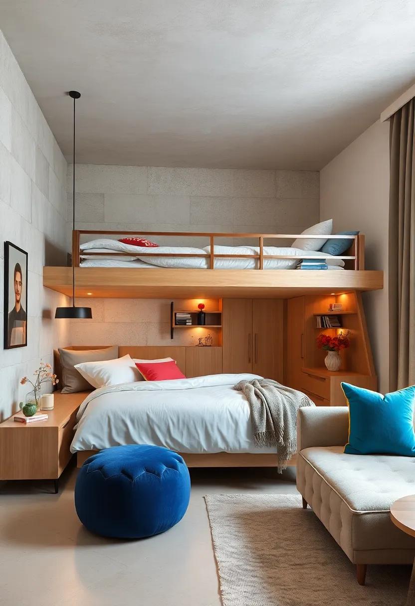 Multi-Functional Bed: Consider a lofted bed design that incorporates a workspace or sitting area underneath for extra functionality