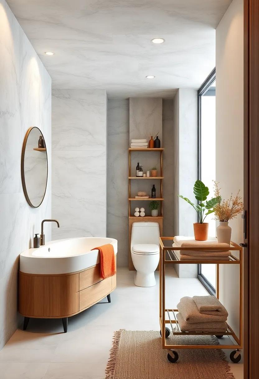 A bathroom cart is a chic and functional addition that can transform your space without renovation. These versatile carts come in various styles and sizes, making them perfect for both small bathrooms and larger ones. Imagine a two-tiered wooden cart with wheels that glides effortlessly across the floor, offering a stylish way to keep toiletries organized and easily accessible. Add a splash of color with a metallic cart, which provides a contemporary feel while allowing you to display your favorite candles and bathroom essentials.Not only does a bathroom cart serve as a mobile storage option, but it also doubles as a decorative element that can elevate your bathroom’s aesthetic.