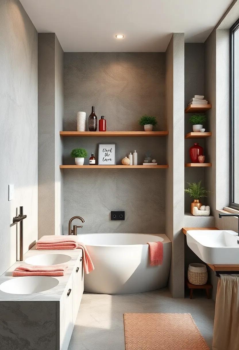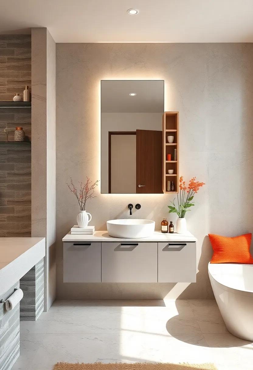 A floating vanity combined with built-in shelving is a game changer for modern bathrooms, marrying style and function.This innovative design elevates your space while offering practical storage solutions. Create an airy ambiance by opting for light woods or sleek, glossy finishes that reflect light.Custom shelving integrated into the structure of the vanity allows for easy access to your essentials, providing a seamless look that reduces clutter. Consider using open shelves for decorative elements like plants or framed photos, alongside closed storage for more personal items, ensuring that your bathroom remains both lovely and organized.