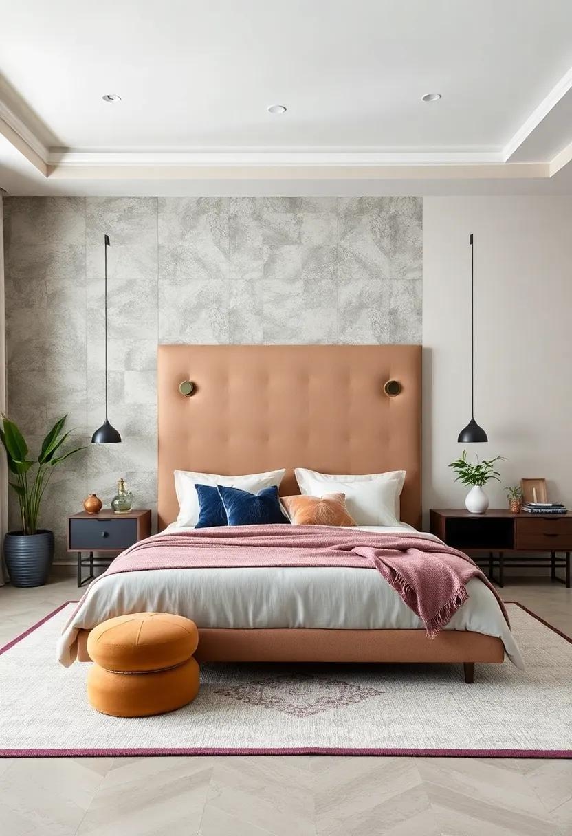 Create a Statement Headboard: Install a bold statement headboard to anchor the room’s design, serving as a focal point without taking up floor space