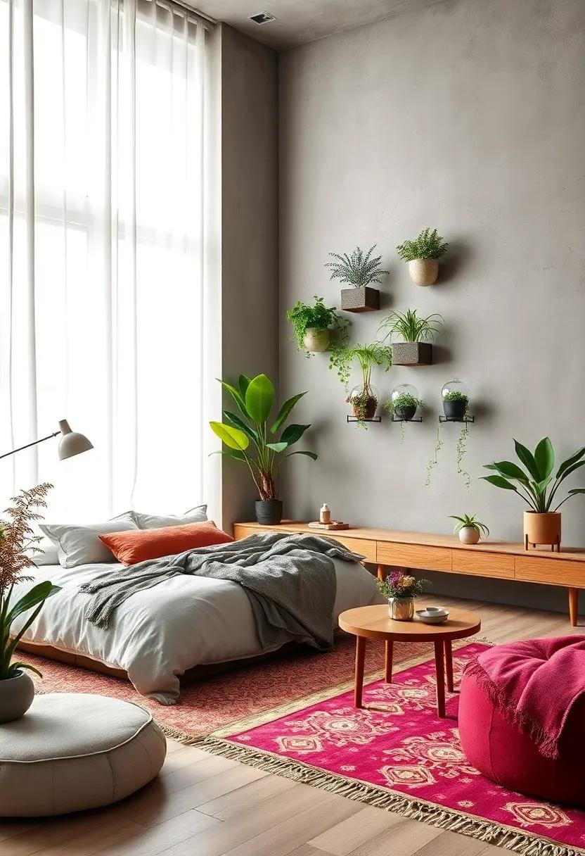Add a vibrant touch to your bedroom with the integration of plants through innovative wall-mounted planters or stunning terrariums. This approach not only introduces the healing properties of greenery but also reflects a stylish biophilic design. Imagine a living mural made of cascading vines or a sleek geometric terrarium that serves as a focal piece above your bedside table. The inclusion of these green elements breathes life into your space, transforming it into a sanctuary of nature without compromising valuable floor area.