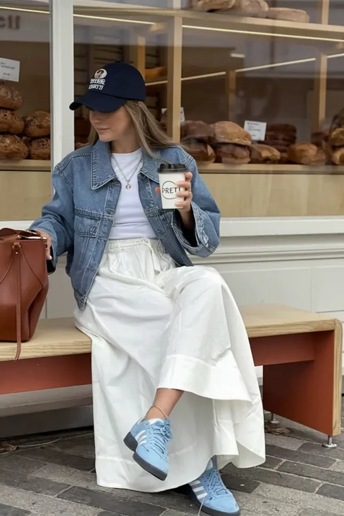 The denim jacket is the linchpin of this outfit — mid-wash and oversized enough to allow layering as the weather cools. Pairing white trousers with sporty sneakers in fall defies norms but creates a crisp, contemporary appearance. A roomy leather tote announces “ready for anything,” perfectly blending function with style. This combination is an essential addition for those who appreciate effortless fall casual looks.