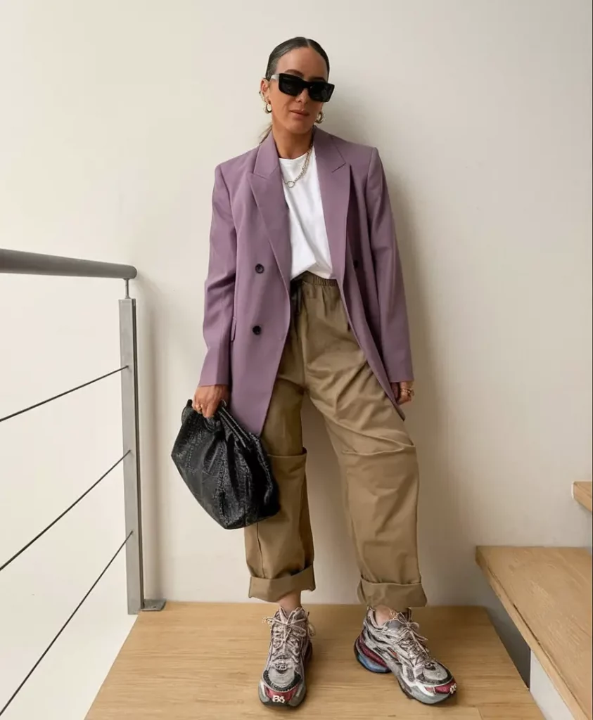 The “anti-jean” slouchy trousers offer comfort and versatility, while the lavender and khaki color combo brings understated sophistication. Ideal for art exhibitions or casual lunches, the normcore sneakers layer in authenticity as the blazer imparts elevated fashion credibility.