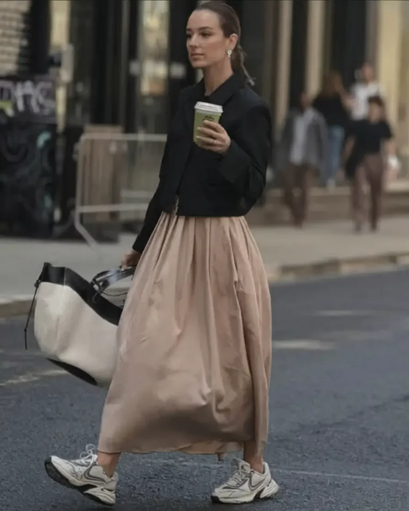 This blend of femininity and ease uses a taupe balloon skirt matched with a cropped black jacket, softened by silver-gray dad sneakers—offering a charming play of proportions suitable for urban life.
