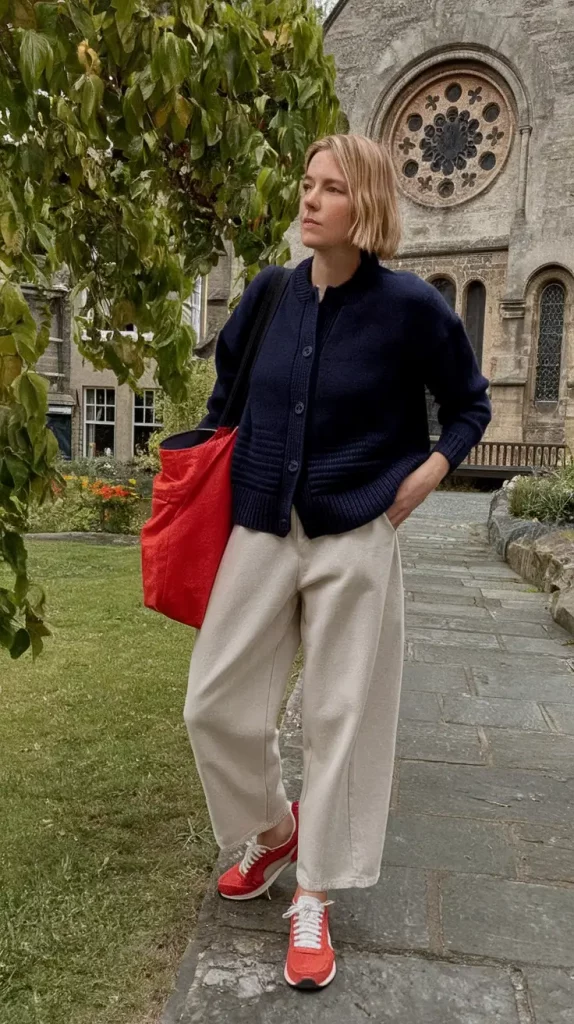 Color blocking is staging a powerful return this season, with red-on-red accessories creating focused vibrancy without overwhelming. The soft cream pants balance intensity, while the warm cardigan is perfect for brisk fall mornings.