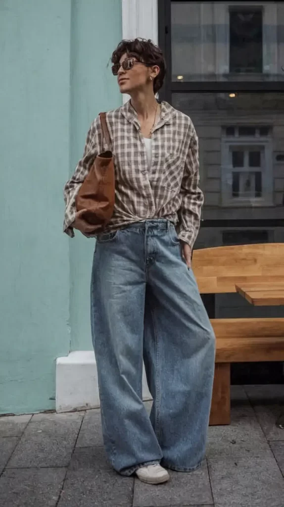 Wide-leg jeans, an oversized beige and olive plaid flannel shirt, white sneakers, and tortoiseshell sunglasses evoke familiar yet revitalized nostalgia. The casual yet purposeful look blends warmth, texture, and streetwise ease.