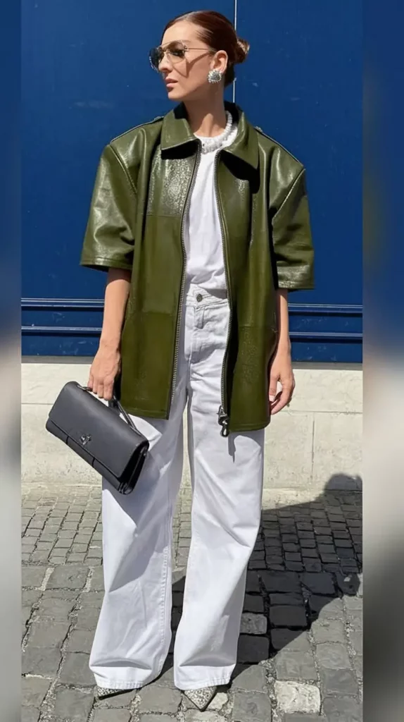 A clean white tee and matching wide-leg white jeans create a crisp foundation for a high-gloss olive green patent leather short-sleeve jacket. Sculptural earrings and a sharp black clutch complement this sophisticated yet approachable look, finished by neutral python print boots.