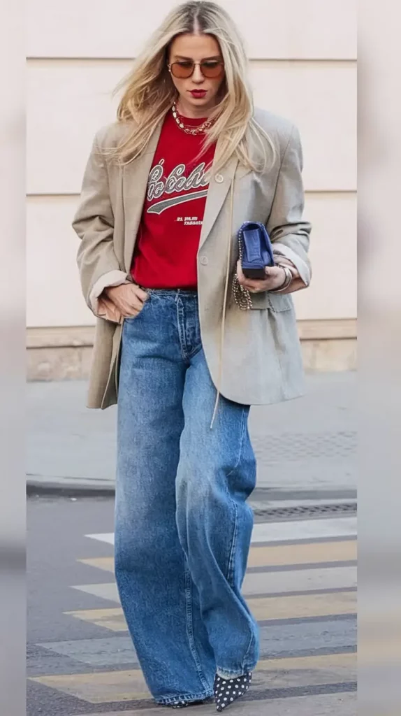 An oversized tan blazer frames a neon red varsity tee layered under a white shirt, paired with wide-leg denim and spotted heels. This mix delivers confident, artfully casual rebellion perfect for sporty-luxe enthusiasts.