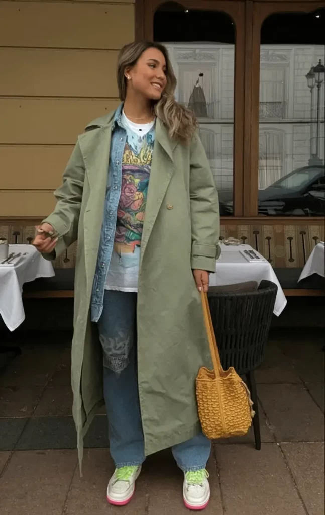 A lively printed tee layered beneath a light-wash denim shirt and sage trench coat, complemented by graffiti-inspired jeans, white sneakers with neon green laces, and a mustard yellow leather bucket bag, creates a vibrant, conversational ensemble.