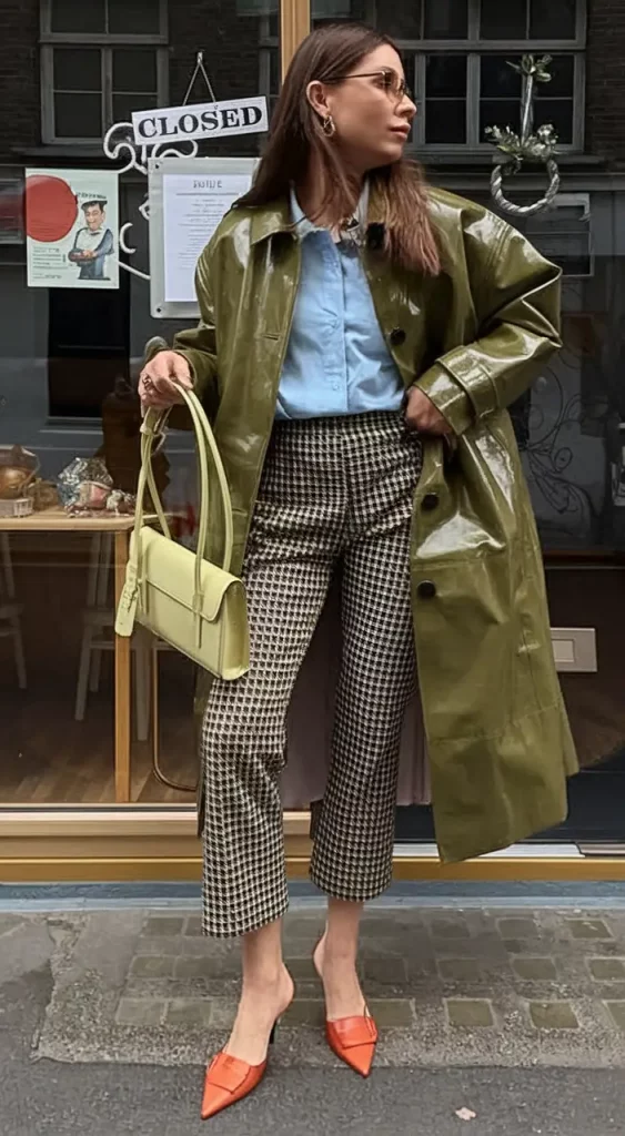 The combination of cropped houndstooth trousers and a pale blue button-up shirt anchors this look, topped with a patent olive trench and bright accessories—a pair of orange flats and lemon yellow baguette bag add unexpected zing.