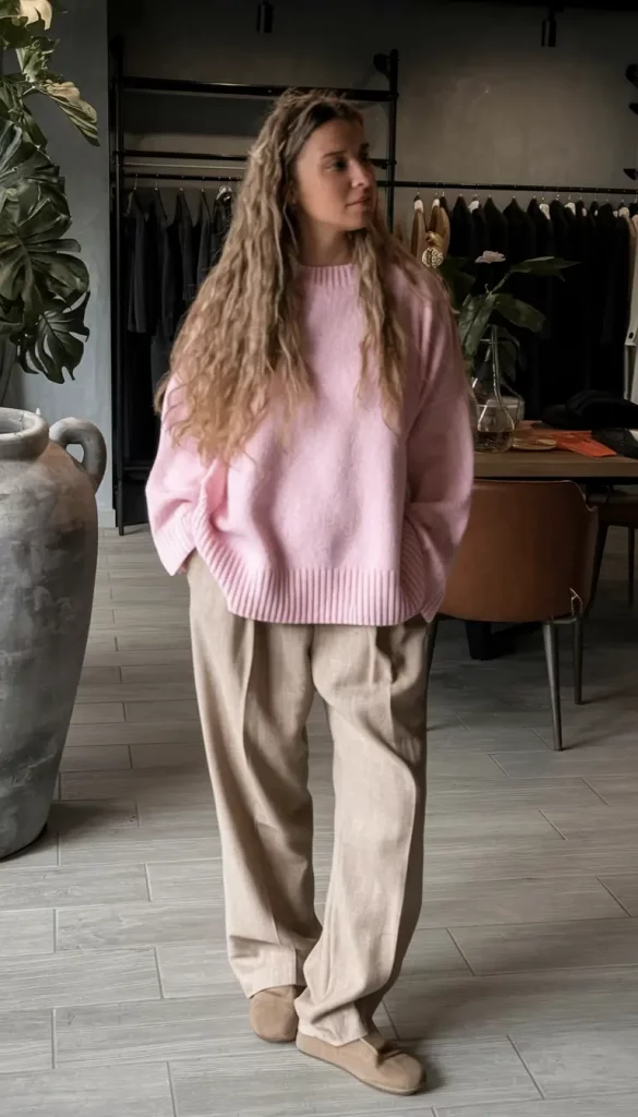 The allure of an oversized dusty pink knit is undeniable—it invites moments spent sipping warm chai on drizzly afternoons while weaving a story of relaxed sophistication. Coupled with wide, beige trousers and taupe suede slippers, this outfit whispers comfort and nonchalance, reminiscent of creamy oat milk foam textures.