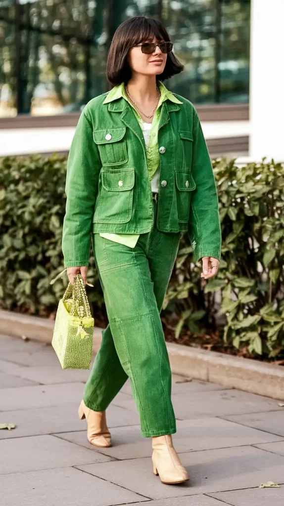 Daring head-to-toe green—denim jacket and trousers paired with a shiny lime blouse and textured gingham handbag—showcases how committed color layering commands attention. Cream ankle boots soften the look just enough.