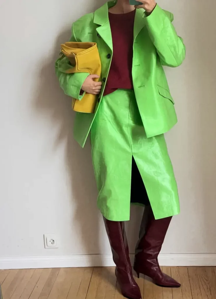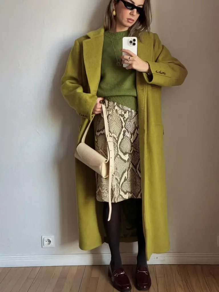 Combine a lime-green wool coat over moss green knitwear, finished with a snakeskin pencil skirt, burgundy loafers, and a sculptural ivory shoulder bag. This grown-up playful look balances texture and color expertly.