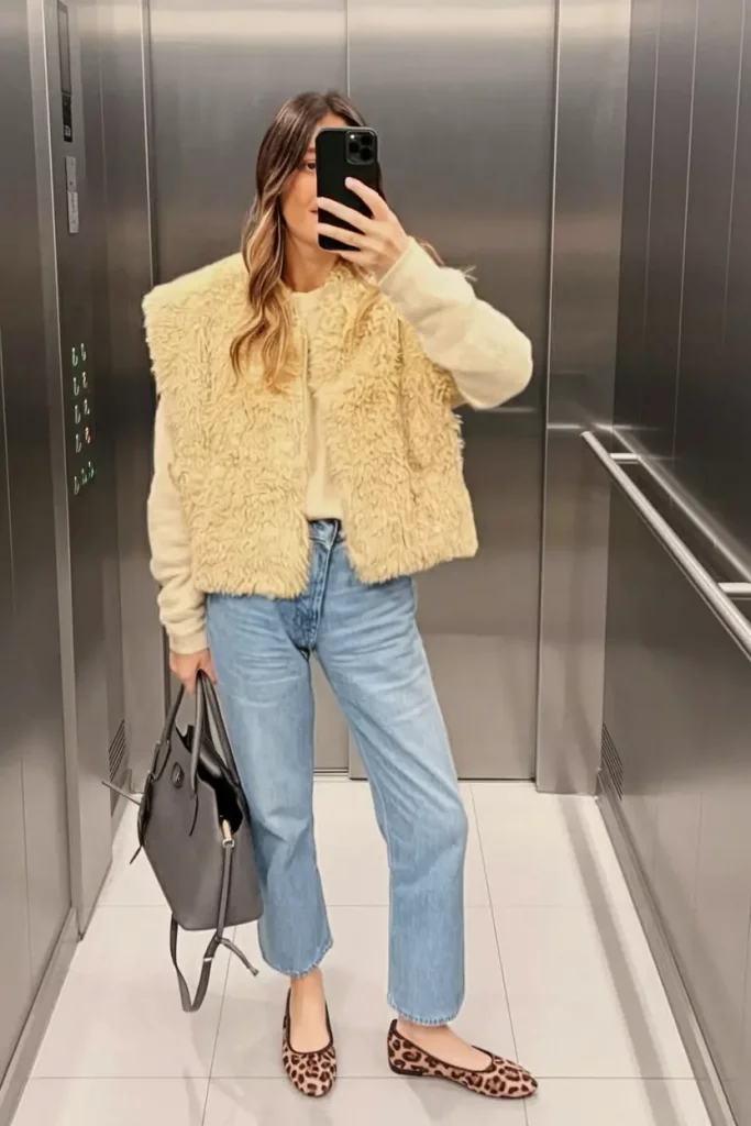 A beige shearling vest layered over a knit sweater and paired with straight-leg mid-wash jeans delivers cozy chic with an edge. Leopard-print ballet flats and a structured black leather tote introduce pattern and contrast, completing this understated yet striking look.