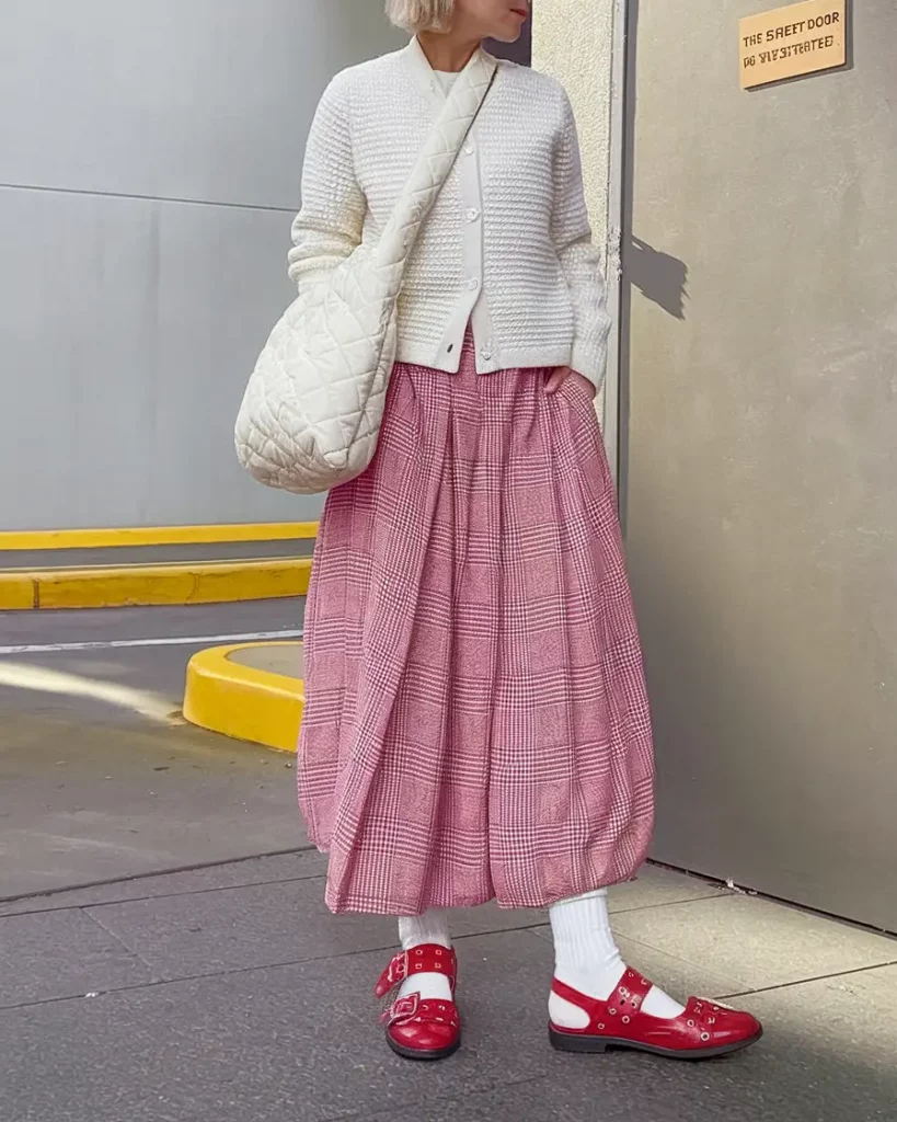 Echoing cozy fall vibes, a structured cream cardigan tucks into a voluminous red gingham skirt, paired with knee socks and shiny red Mary Janes. A puffy cream shoulder bag finishes the nostalgic yet fresh appearance.