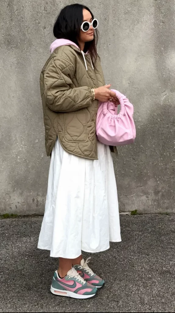 Olive quilted jacket and a wide white skirt combine utilitarian ease with softness, complemented by a pink hoodie, matching sneakers, and a bubblegum pink bag for a youthful twist.