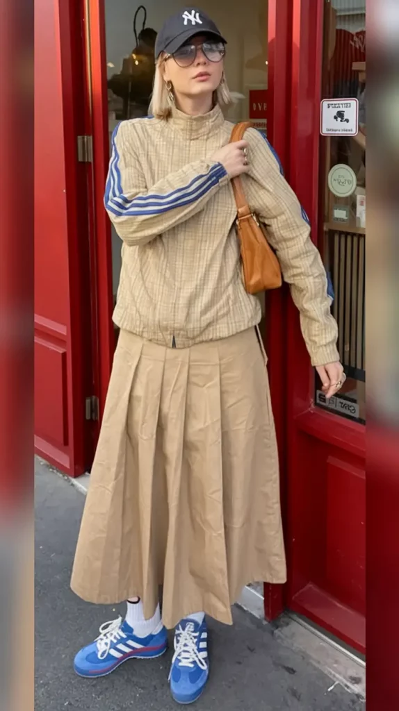 A tan pleated midi skirt paired with a vintage track jacket and cobalt Adidas sneakers creates a harmonious blend of ladylike flair and street style. Accessories like a NY cap and sporty sunglasses finish this effortlessly cool ensemble.