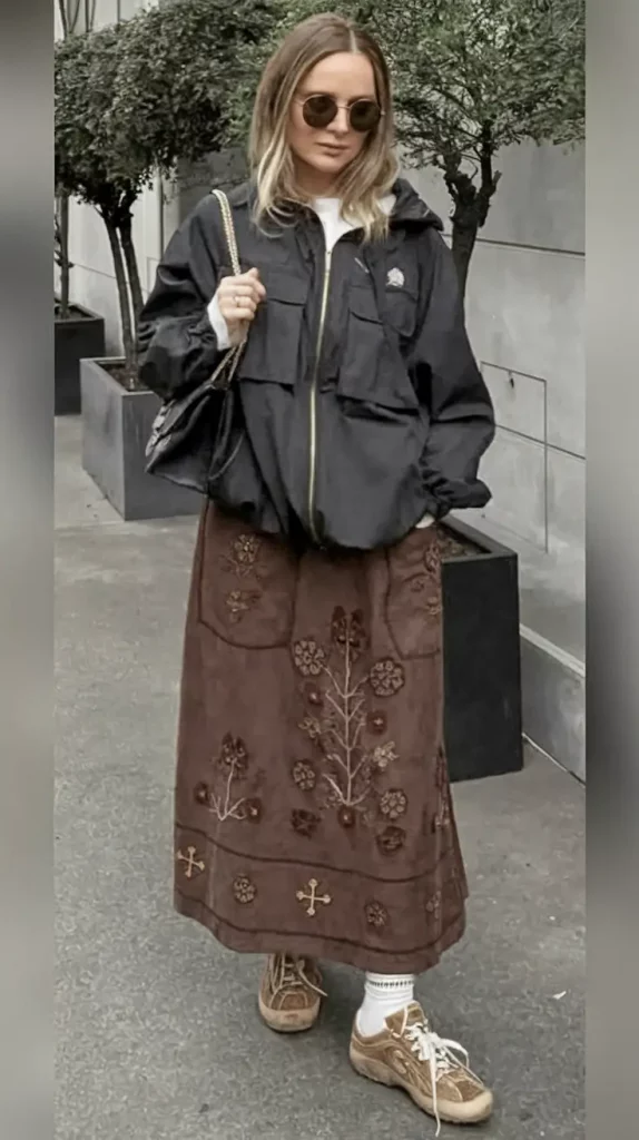 A brown embroidered midi skirt pairs beautifully with a classic black zip-up jacket and taupe trainers. Accessories like a black chain-strap purse and rounded sunglasses add gentle polish.