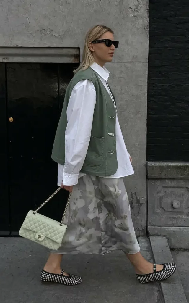 Master the art of balanced layering with a voluminous white shirt combined with a muted green vest and a floral skirt in earth tones—a fresh take on feminine autumn dressing. The quilted mint green Chanel bag injects a dose of understated luxury, while black studded Mary Janes add a touch of rebellious charm.