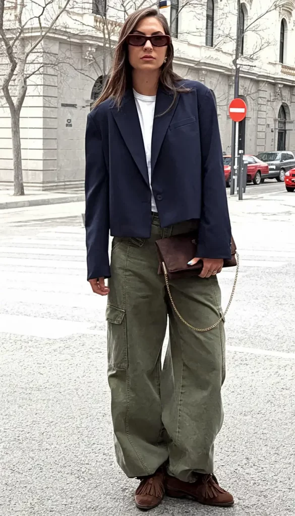 This ensemble boldly combines a cropped navy blazer over a crisp white tee with relaxed olive cargo trousers and moccasin-inspired footwear—a blend of office-smart and streetwise aesthetics. The blazer’s crisp lines contrast strikingly with the casual pants’ volume, while a brown clutch accented with a gold chain elevates the look with a subtle evening edge.