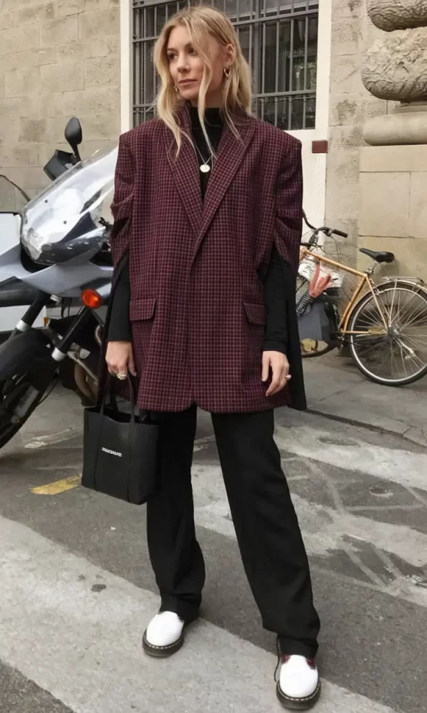 Command attention with a bold checked blazer in maroon and black, pairing oversized shoulders with wide-leg black trousers and a fitted black turtleneck. Chunky white boots provide a surprising contrast, balancing the intensity of the upper half.