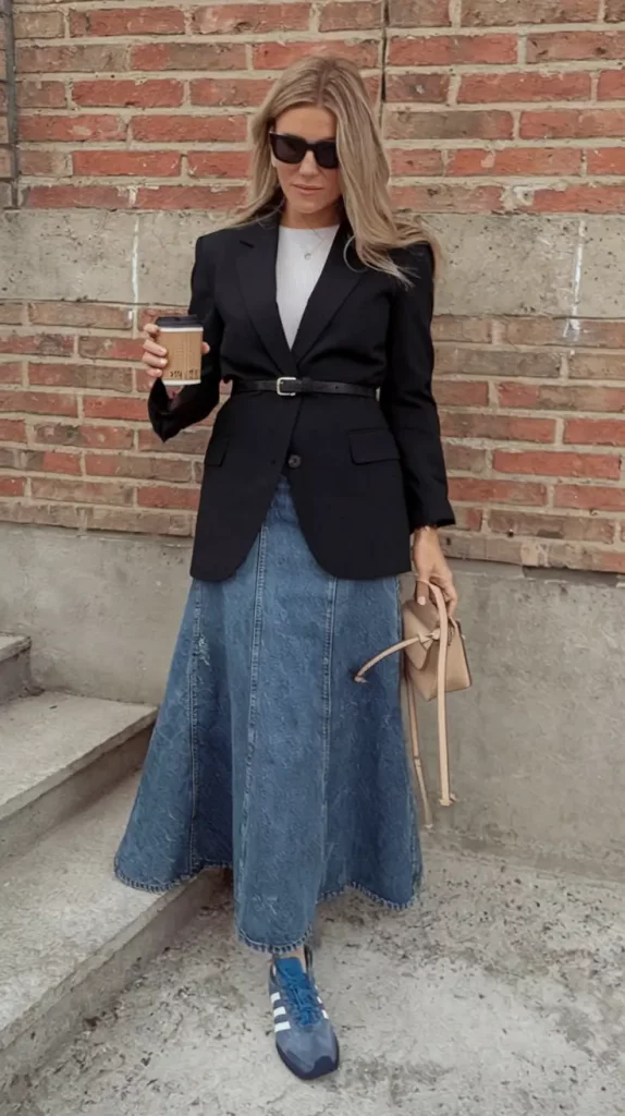 Bridging two seasons with ease, this outfit combines a tailored black blazer, cinched with a belt, alongside a full-length denim skirt and comfortable navy sneakers. Oversized sunglasses introduce an aura of mystery, making this look both polished and approachable.