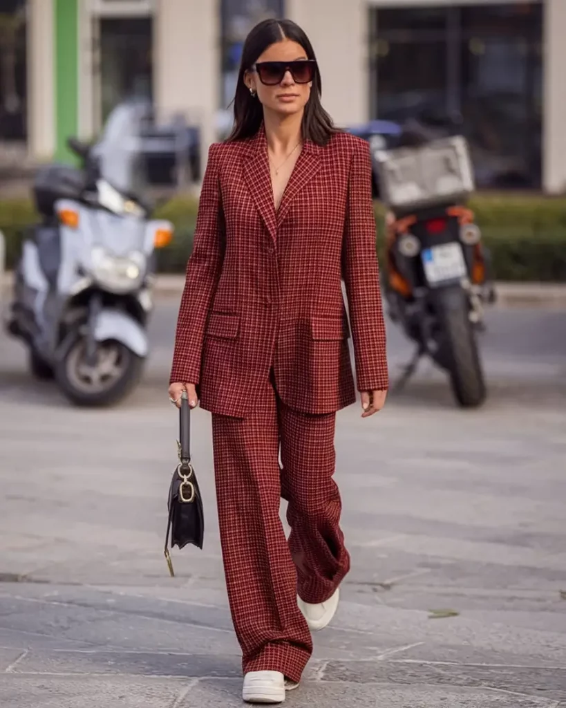 A rust-hued plaid blazer and matching trousers infuse the classic power suit with renewed vitality. Paired with crisp white sneakers and a sleek Dior mini bag, this look exudes confidence laced with streetwise savvy.