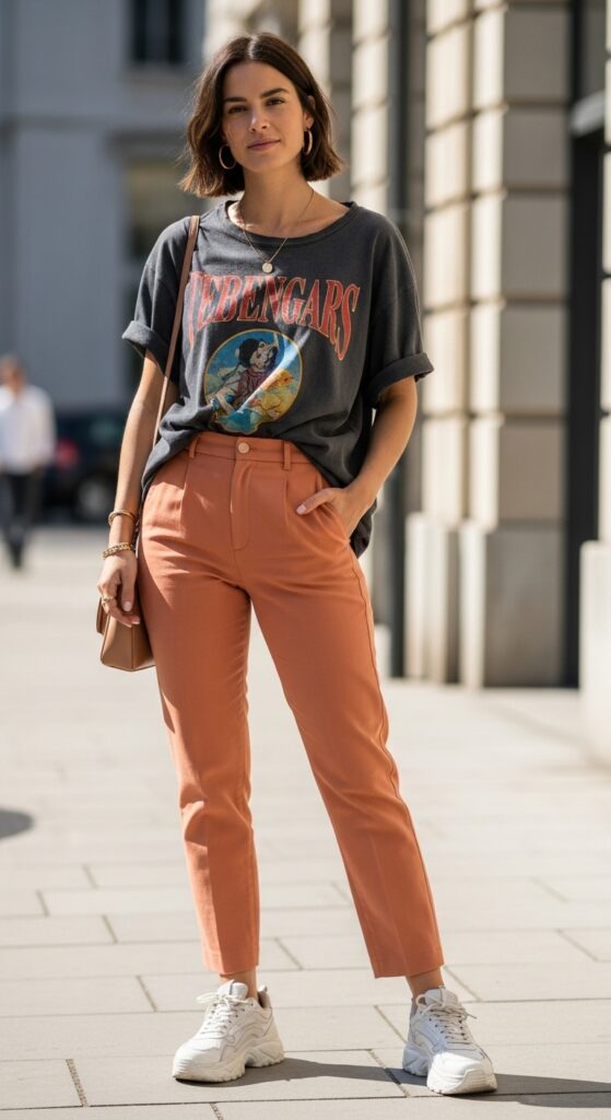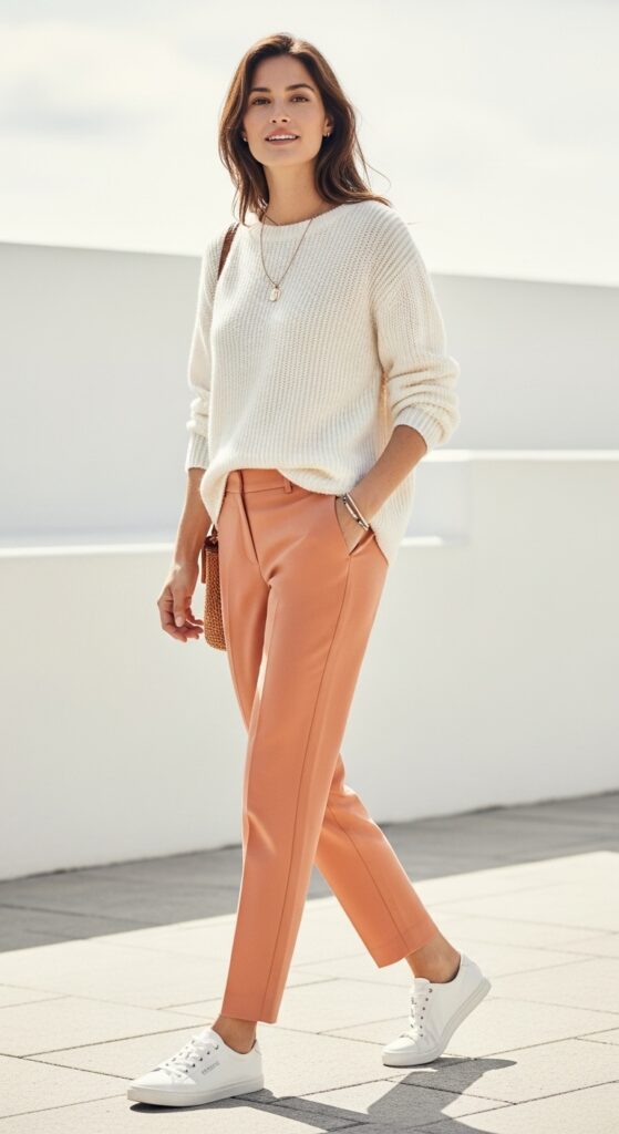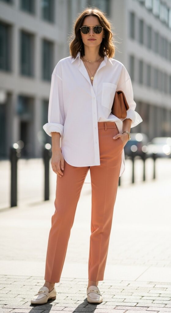 The key is balance: the loose fit of the shirt contrasts beautifully with the crisp tailoring of the apricot bottoms. Slip on cream or tan loafers with a subtle profile (nothing heavy or clunky) to complete this versatile ensemble. Whether it’s brunch, casual Fridays, or a day out that doesn’t call for sweatpants, you’re covered. A delicate gold necklace can add a touch of polish, but honestly, this combination is pure, unpretentious elegance.