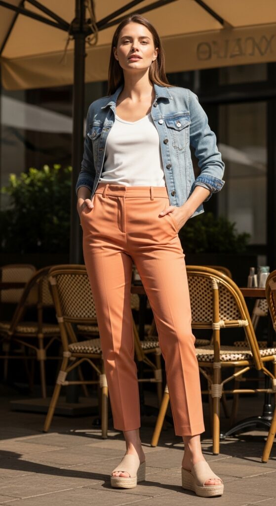 Inject a touch of laid-back cool by layering a classic denim jacket over your soft apricot trousers. Pair it with a simple white tank or tee to create a timeless California-casual vibe. Aim for light-wash denim to beautifully complement the warmth of apricot without creating harsh contrasts.