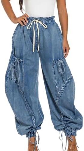 Women Drawstring Bow Jeans Wide Leg Denim Pants Casual Joggers Jean Trousers with Pockets