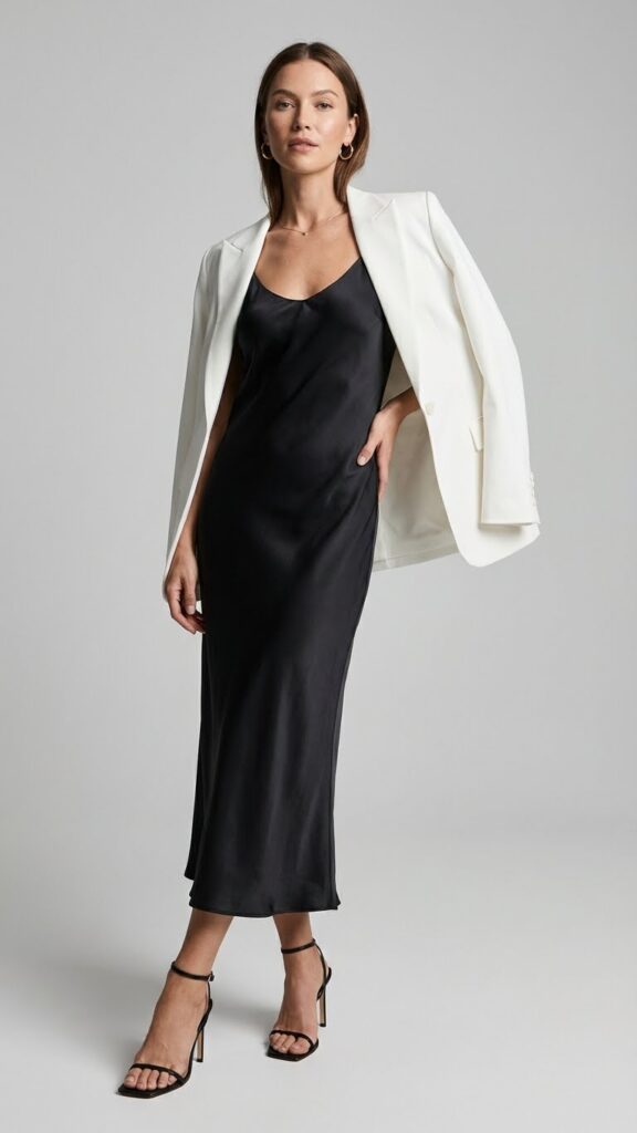 This ensemble radiates unforgettable confidence. A silky black slip dress alone looks stunning; layering it with a structured white blazer instantly amps up the glam factor, creating a captivating blend of softness and edge. The contrast between the blazer’s sharp lines and the dress’s fluid texture builds a visual balance that’s impossible to ignore.