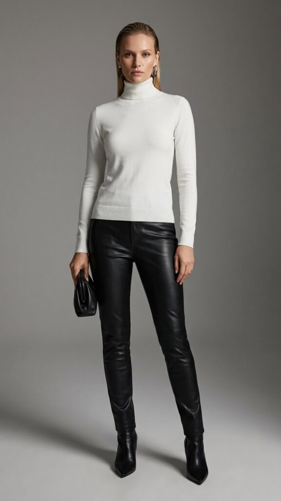 If you haven’t experimented with the combination of a fitted white turtleneck and black leather pants, now is the perfect moment. This outfit effortlessly conveys confidence with a minimalist yet bold approach. The sleek, polished top softens the rebellious texture of the leather, striking a dynamic balance.