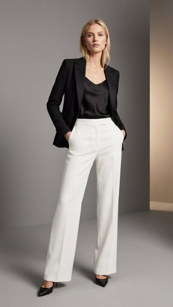 For fashion risk-takers looking to command attention, nothing beats a fitted black tuxedo jacket paired with billowing white wide-leg trousers. This juxtaposition of tailored and flowing pieces offers a striking silhouette that merges strength with femininity.
