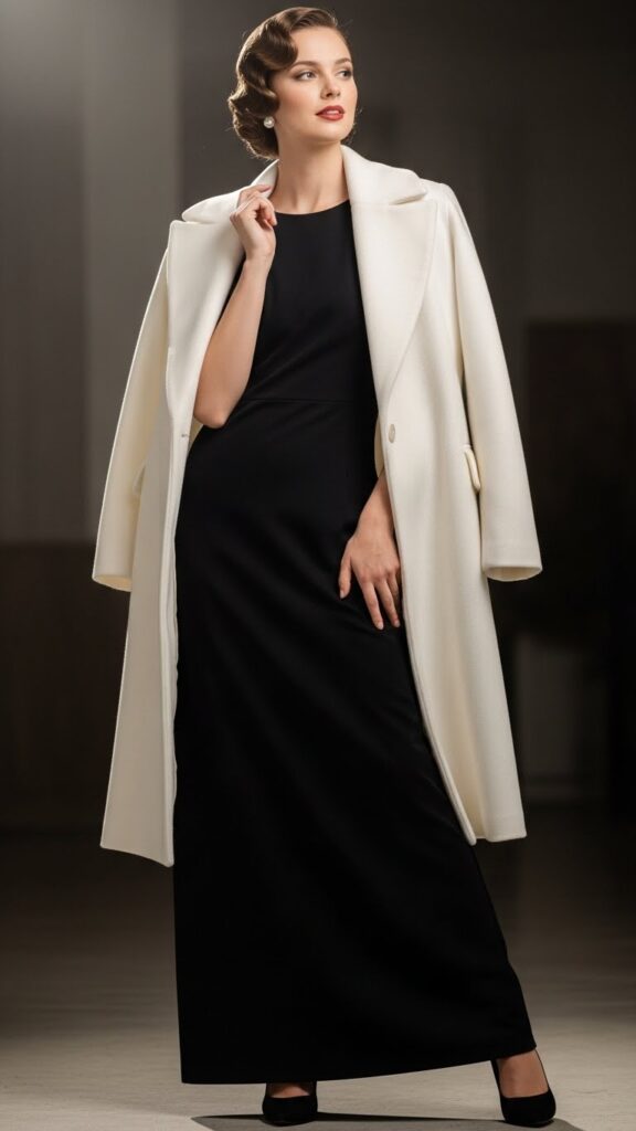 For those wanting to make a lasting impression, a floor-length black maxi dress layered with a stunning white statement coat is an unbeatable choice. This pairing evokes classic Hollywood allure while feeling fresh and modern.