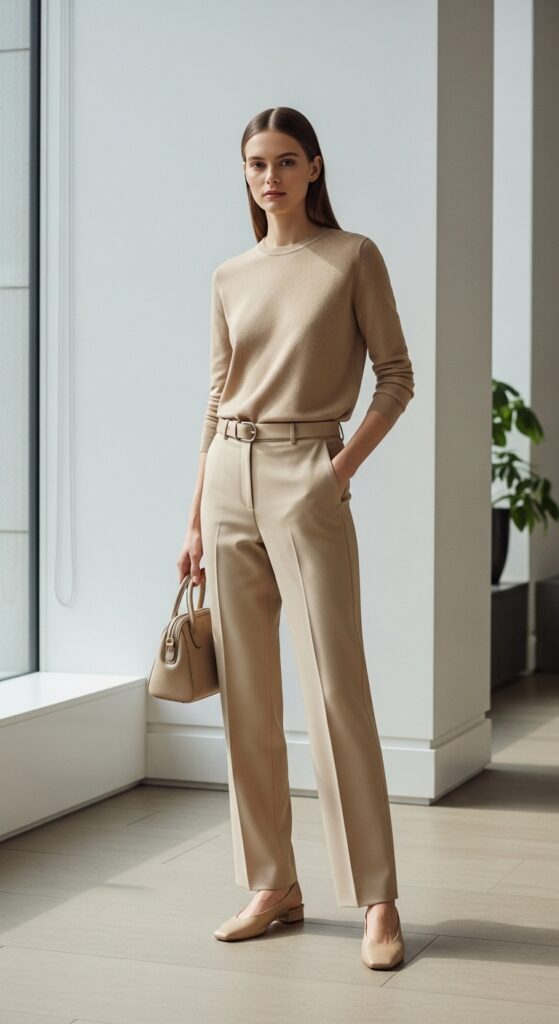 Accessories are optional, but if you want a touch of delicate contrast, try a simple gold necklace or a matching belt. A beige monochrome outfit adds a fresh twist to traditional black—it’s understated yet far from boring.