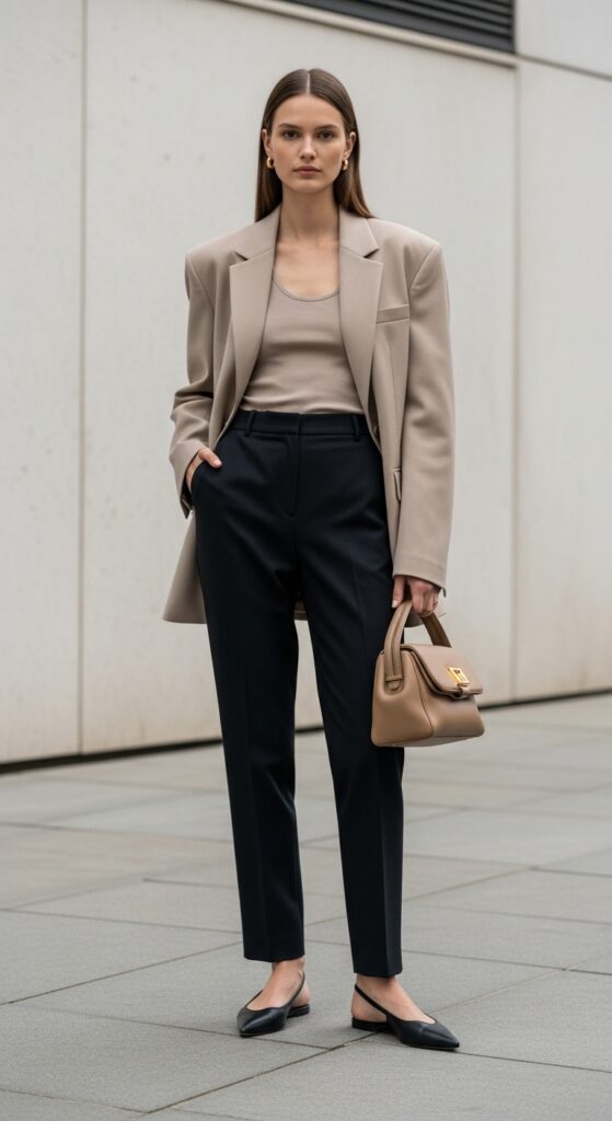 Neutral tones like cream, beige, or soft grey lend a monochromatic appeal that is sophisticated yet understated. Complete this look with pointed-toe mules or flats and a structured handbag for polish. This outfit transitions seamlessly from office hours to after-work gatherings or gallery visits, all while keeping style at the forefront with minimal effort.