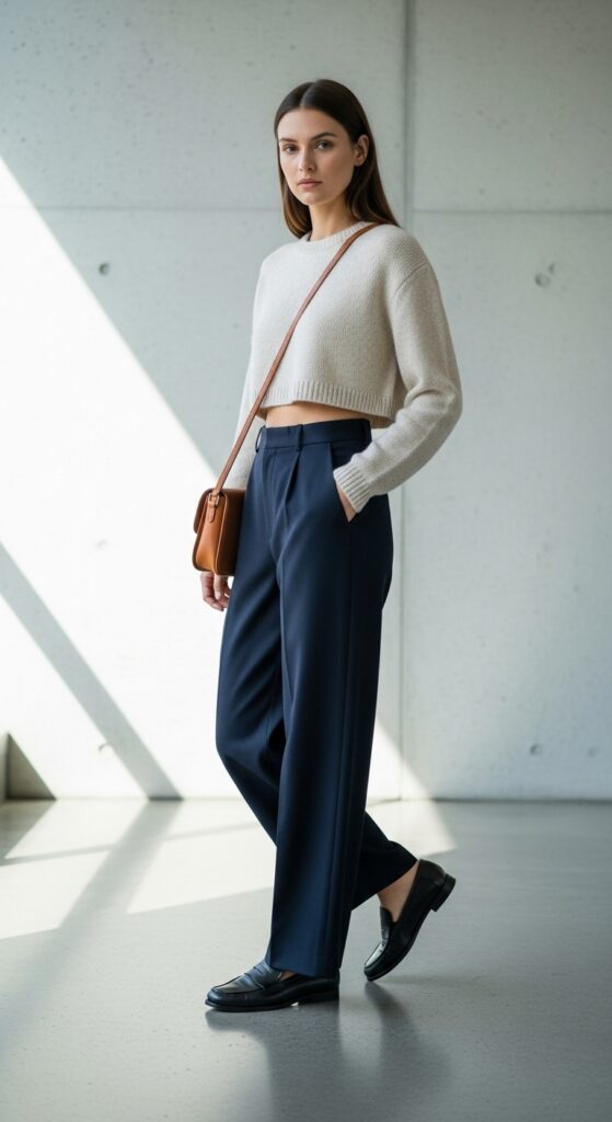 Play with proportions by pairing high-waisted Uniqlo trousers with a cropped sweater or knit. This silhouette highlights the waistline without feeling revealing—ideal for maintaining minimal yet dynamic styling.