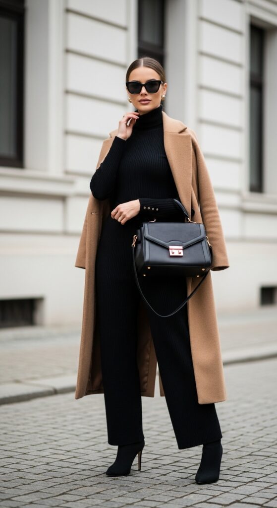 A fitted turtleneck paired with high-rise knit trousers is an iconic look that never fades. This combo offers a streamlined, flattering silhouette that transitions effortlessly from day to night. Opt for a single color scheme—maybe a deep navy or warm camel—for an elegant and cohesive appearance.