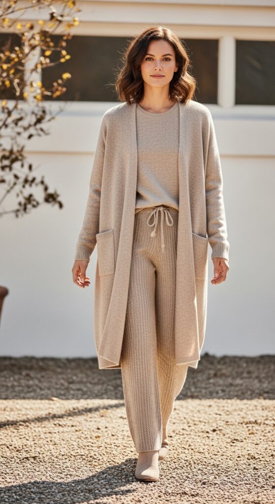 Neutral colors like beige, greys, or soft oatmeal enhance versatility, and cinching the cardigan at the waist with a belt can add shape and definition. Whether paired with slides or ankle boots, this look balances casual comfort with refined ease—making it ideal both for leisurely activities and casual outings.
