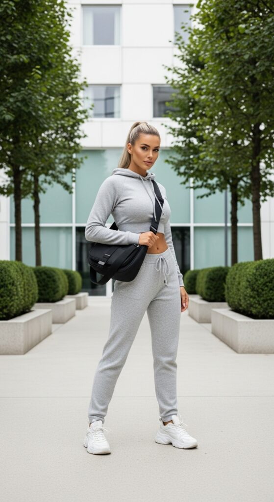 Knit trousers aren’t just for lounging—they make a fantastic foundation for a sleek sporty aesthetic. Pair them with a fitted hoodie or streamlined sweatshirt for a casual, off-duty model look that’s both stylish and comfortable.